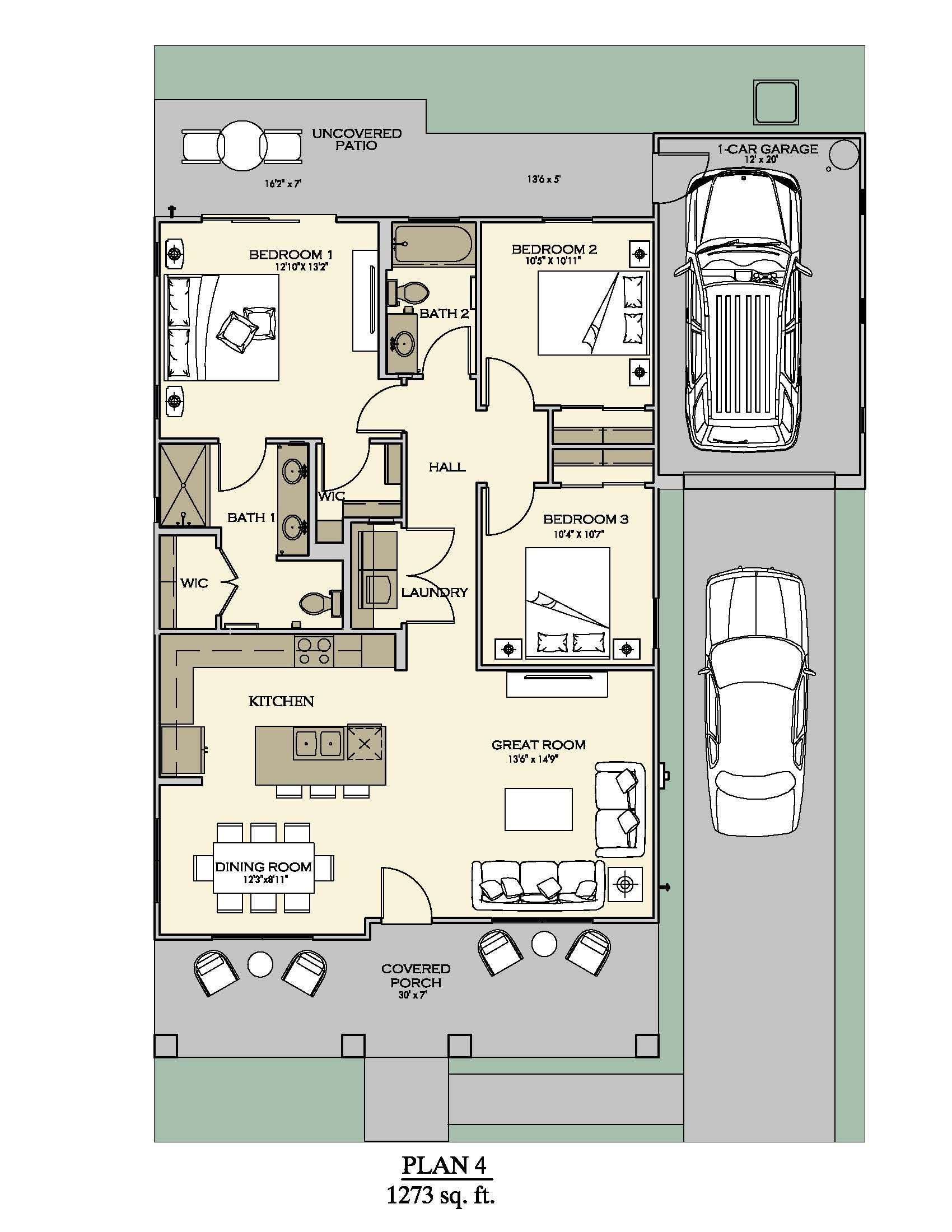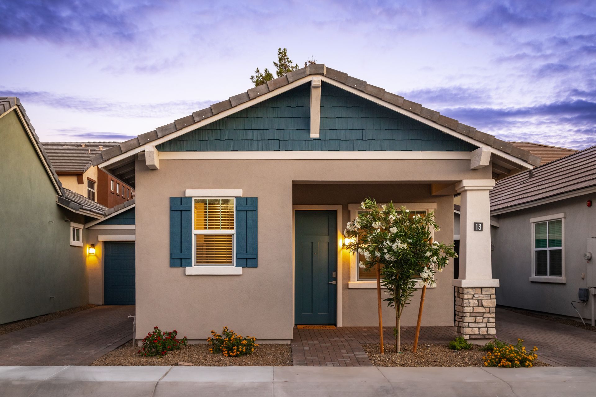 The Maybeck is an cozy Craftsman Bangalow style 3 bedroom/ 2 bath home with a dormer element and coastal blue color scheme. Two large windows keep the inside light and airy, while the full covered porch provides additional space to enjoy.