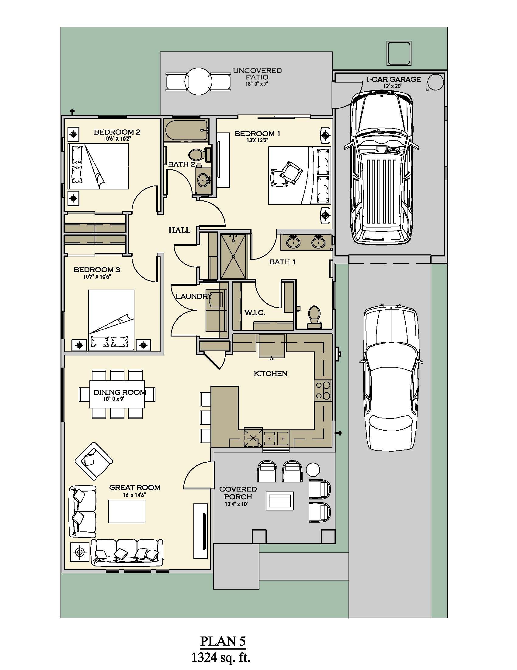 The Thorsen is a traditional Craftsman Bungalow 3 bedroom, 2 bath home featuring a multi-pane double hung picture window, olive siding, ginger shutters, and a front door. A spacious great room and kitchen are perfect spots for entertaining.